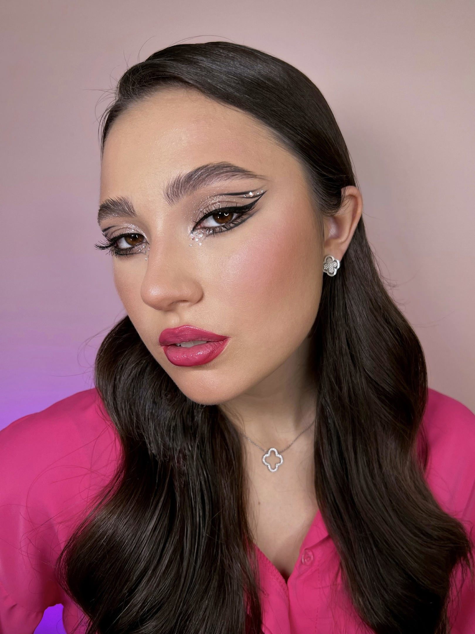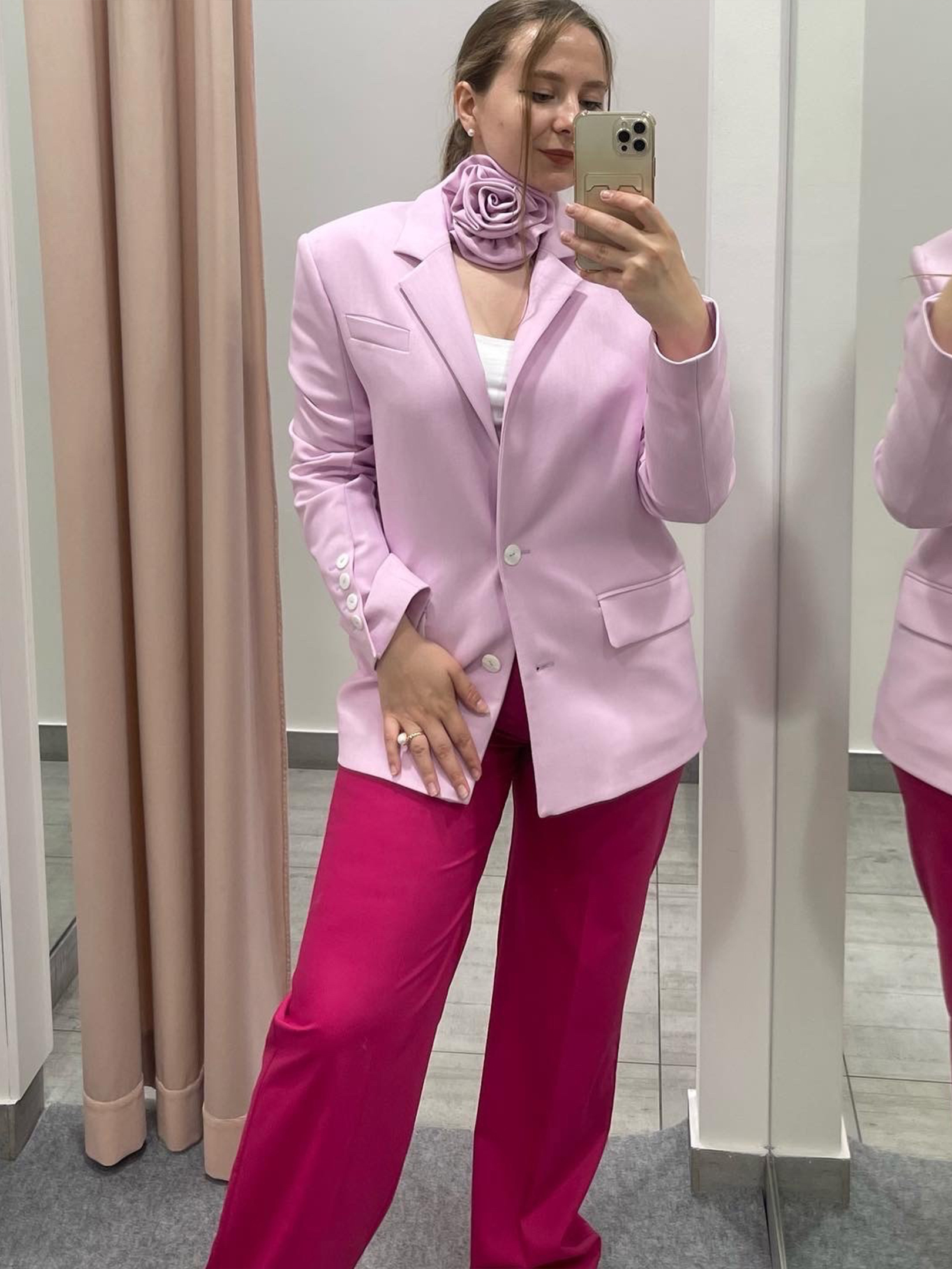 Не стоит сразу же выбирать себе total pink, следуя трендам и не зная, про что вы и ваш индивидуальный стиль. Если вы уже знаете свой типаж, имеете насмотренность в стиле, то можно (и нужно) проявлять индивидуальность. К примеру, сочетая монохромные оттенки розового в образе, делая яркими акценты в аксессуарах. Новичкам можно начинать с аксессуаров либо добавлять детали розового цвета в свой гардероб. Что касается меня, то я взяла себе розовые брюки-палаццо и рубашку на тон светлее, а завершаю образ трендовым чокером в виде цветка тоже в розовом оттенке.